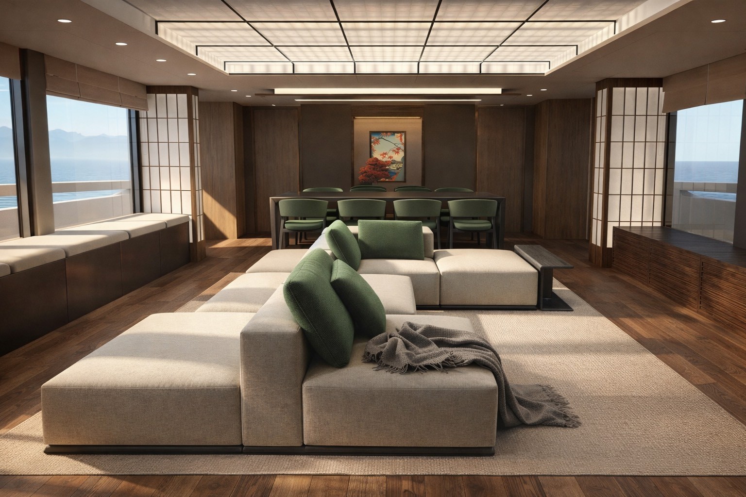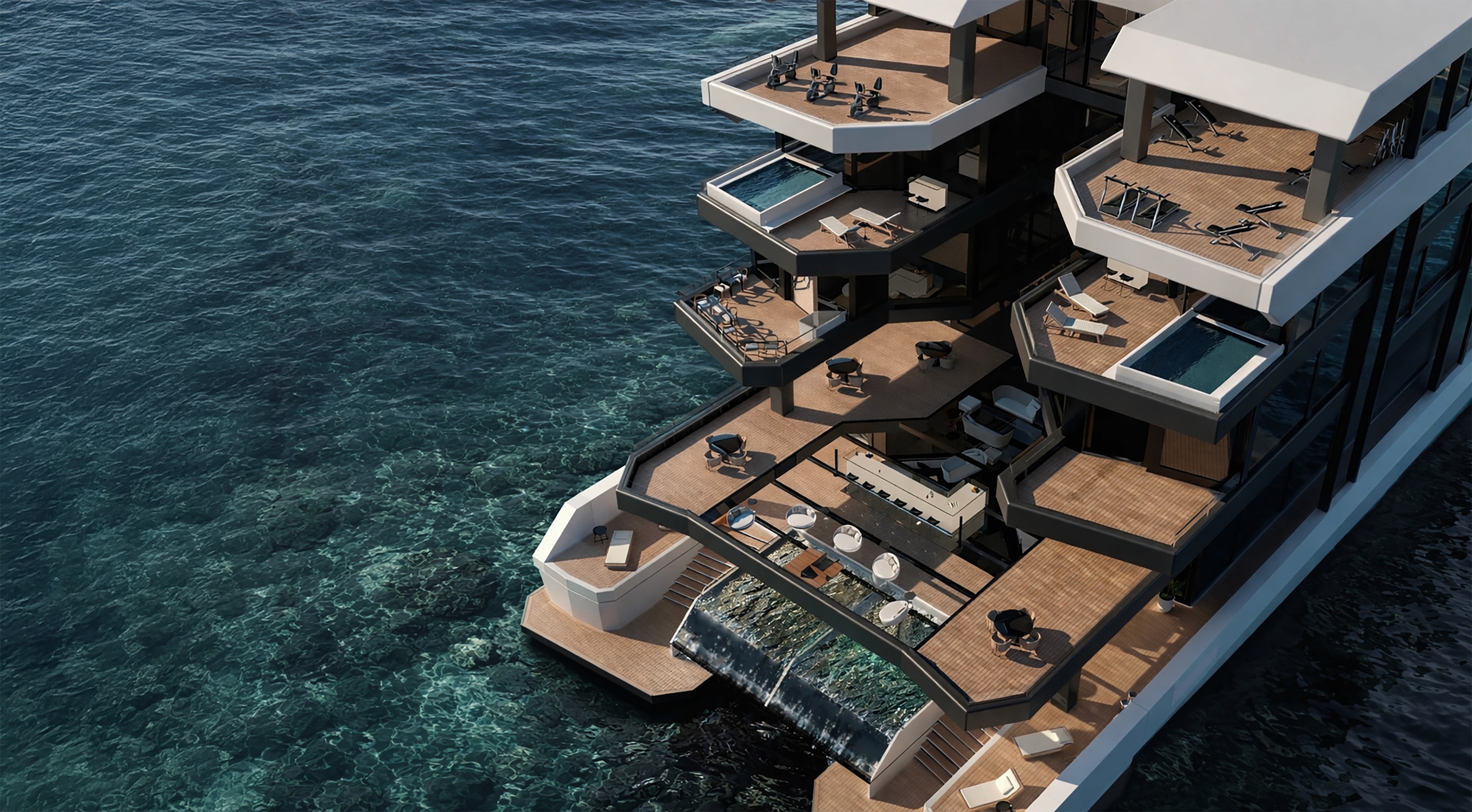 The cabin design is conceived as a private retreat within the larger spatial system of the ship, where comfort, light and material quality define an intimate relationship with the sea. Different cabin typologies — from standard to VIP and Royal Suite — are developed through a gradual increase in spatial openness, views and functional complexity, while maintaining a coherent design language. Inspired by Scandinavian principles, the interiors feature warm wood finishes, soft textures and neutral color palettes that enhance calmness and spatial clarity. Large glazed surfaces and panoramic balconies reinforce the visual connection with the horizon, transforming the cabin from a simple accommodation unit into a personal living space in continuous dialogue with the marine landscape.