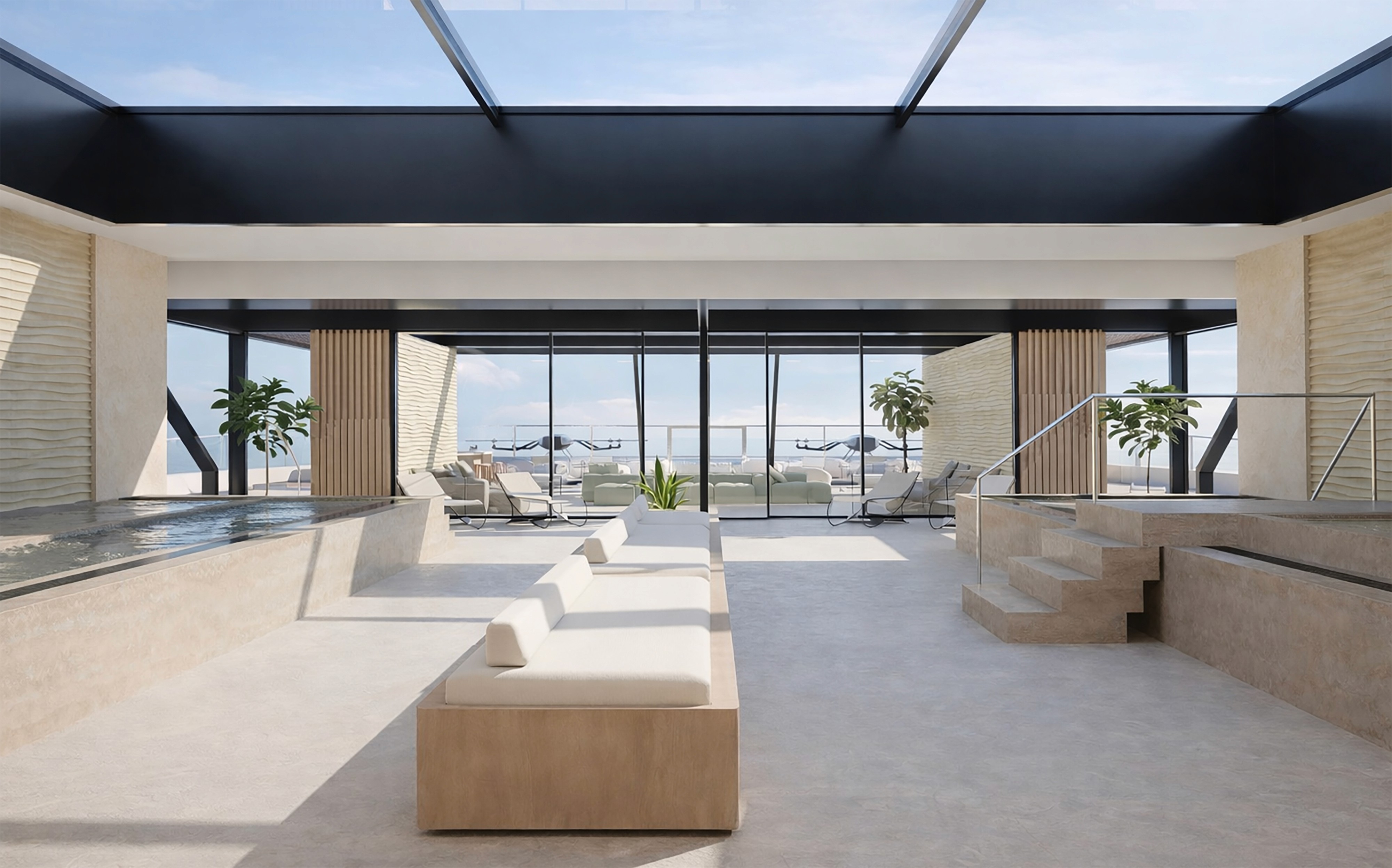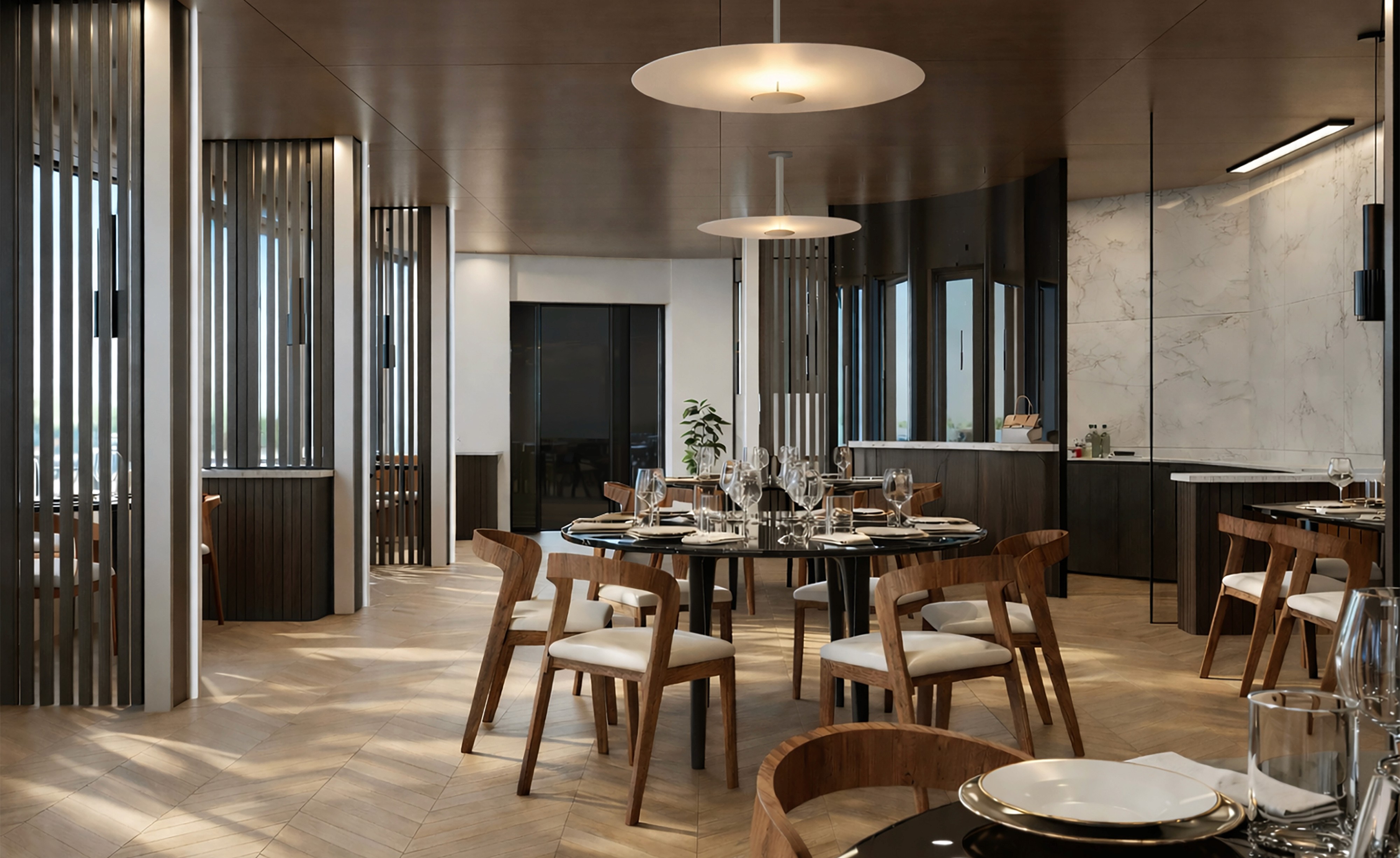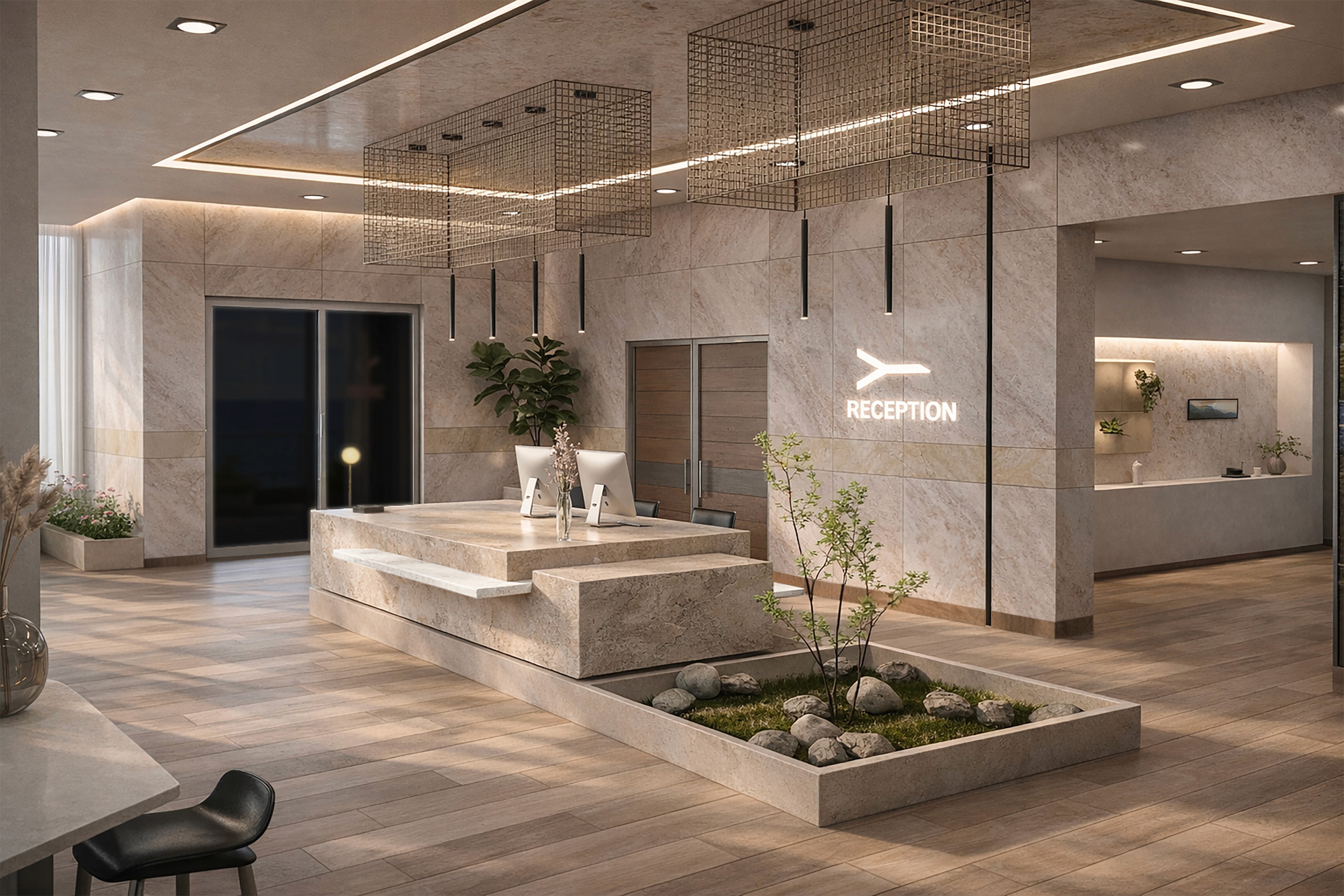 The interior design is conceived as a continuous spatial system in which public and private areas are connected through a coherent architectural language. Spaces such as the reception, Green Park, spa, restaurant and cabins are designed as different expressions of the same concept, based on fluid geometries, natural light and material continuity. Inspired by Scandinavian design principles, the interiors favor warm wood surfaces, neutral tones and soft transitions between functions, creating calm and readable environments. Through this approach, interior architecture becomes a tool to enhance well-being, spatial clarity and the relationship between the built environment and the marine landscape.